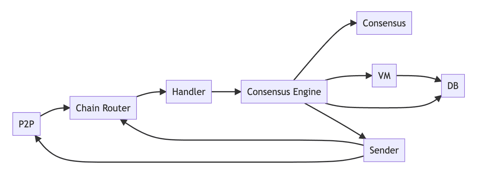 Each blockchain on Avalanche has several components: the virtual machine, database, consensus engine, sender, and handler. These components help the chain run smoothly. Blockchains also interact with the P2P layer and the chain router to send and receive messages.